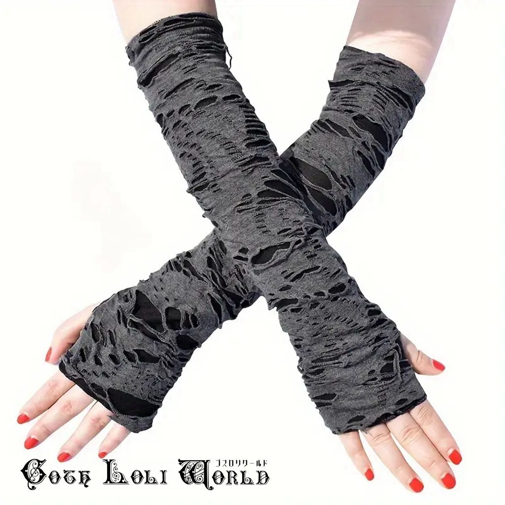 - 即納 GE101CE ダメージ加工ロングアームウォーマー グレー色 男女兼用 メンズ レディース ファッション パンク ロック モード系 サブカル