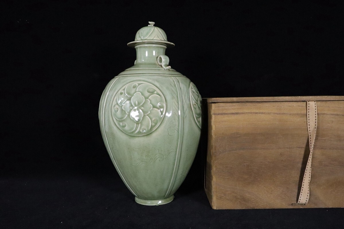- 「北宋 越窯 陶磁器 青釉団花紋 帯蓋 双系 梅瓶」染付 置物 擺件 古賞物 中国古美術 旧蔵出