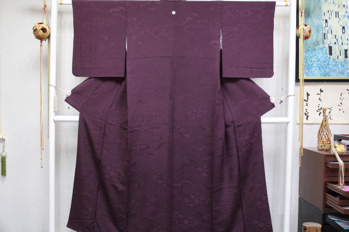> きもの今昔8761 色無地きもの 広衿袷手縫仕立 高級正絹紋意匠画像①②⑤が近い 家紋入り「左三つ巴」身丈152cm