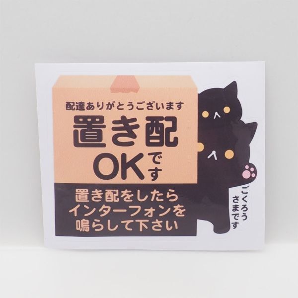 - 新品 置き配ステッカー 11.5cm x 9cm 置き配をしたらインターホンを鳴らしてください ネコ親子 黒猫 管19101