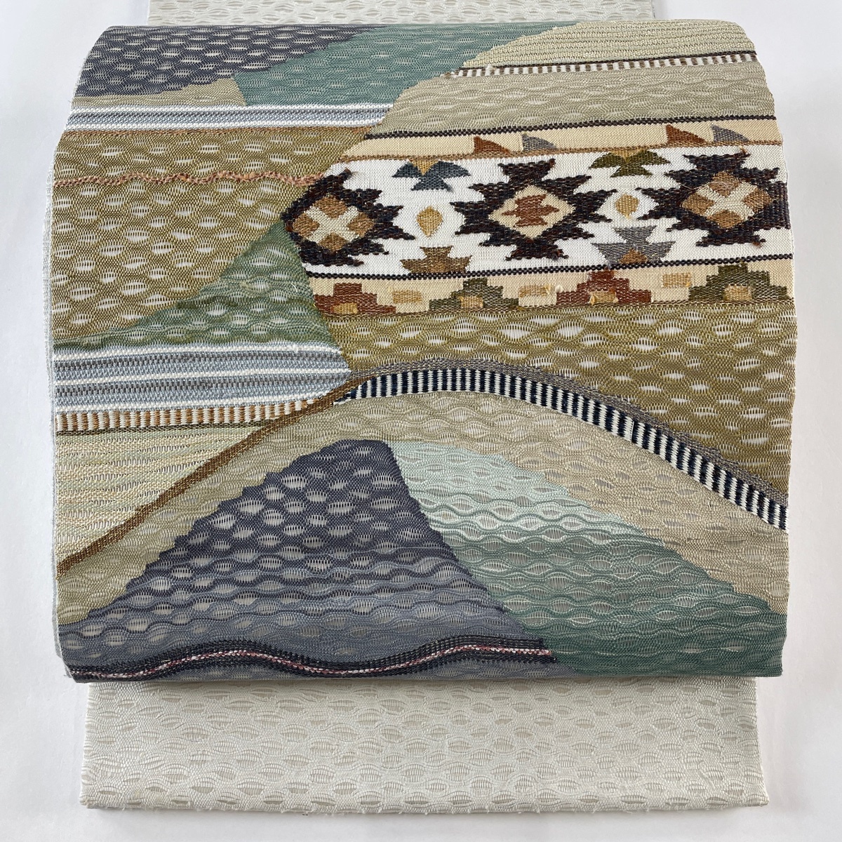 - 袋帯 美品 秀品 幾何学 金糸 青灰色 お太鼓柄 正絹 【中古】