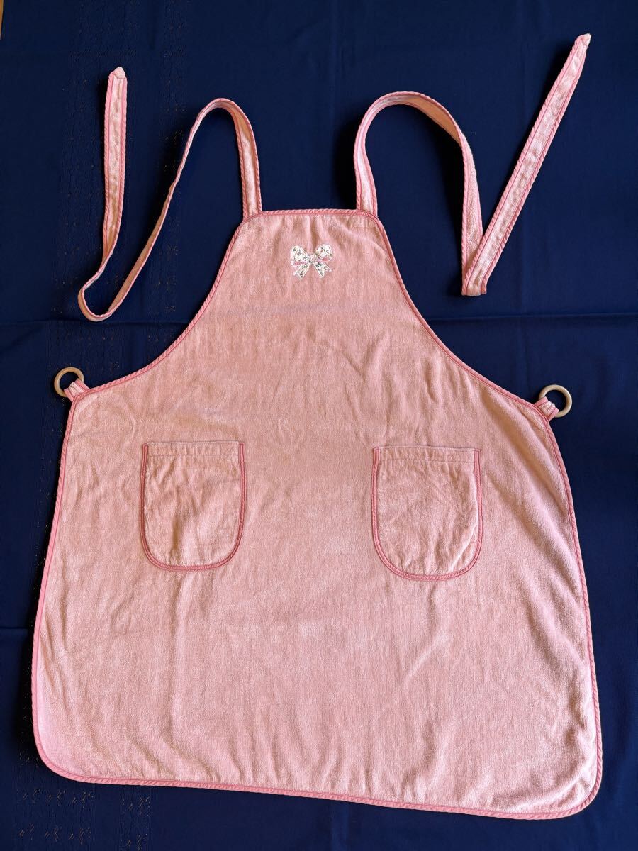 - タオル生地 サーモンピンクのリボン刺繍 エプロン M