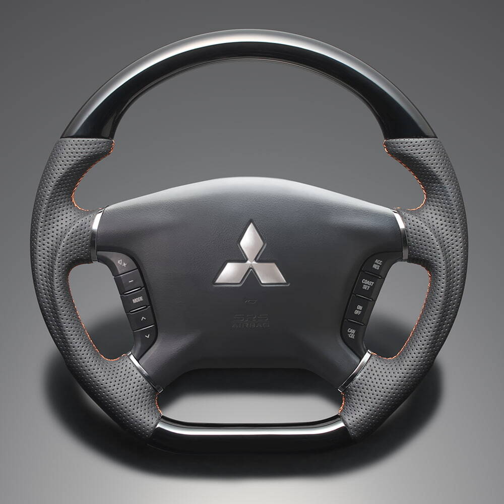 - FEGGARI デリカD5 CV系 前期 ステアリング ピアノブラック x PVCレザー(ダークグレー) x オレンジ ユーロステッチ / LS295 フェガーリ