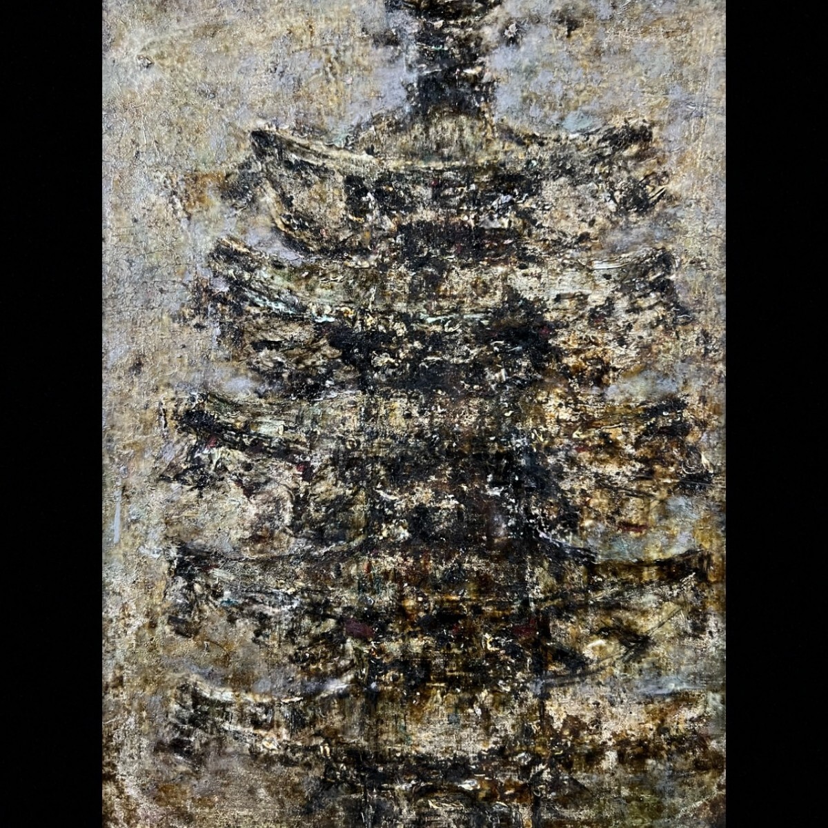 - 真作保証 藤永正二「五重の塔」肉筆油彩6号 風景画 裏サイン 山口県出身画家 額装[麌]
