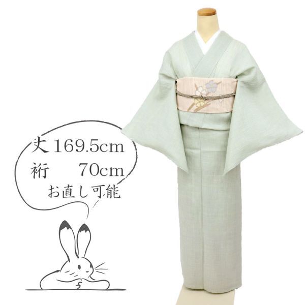 > 【小紋】 新品 長尺 本麻 『近江ちぢみ』 縞 柳鼠グリーン 夏着物 KG7-81