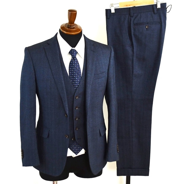 ・春秋対応。ベスト付き。2つボタンシングル。袖口4つ釦本切羽。総裏地仕上げ。センターベント。フラップポケット。ネーム刺繍あり。