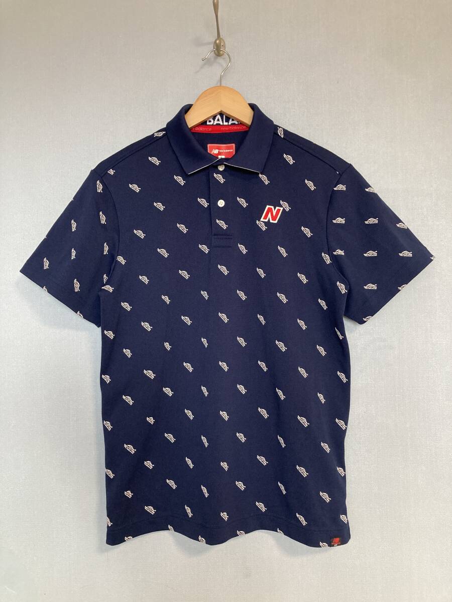 - ★美品 new balance golf ニューバランス ゴルフ 半袖ゴルフシャツ 6 ネイビー スニーカー文字ロゴ 総柄 ポロシャツ 半袖シャツ メンズ