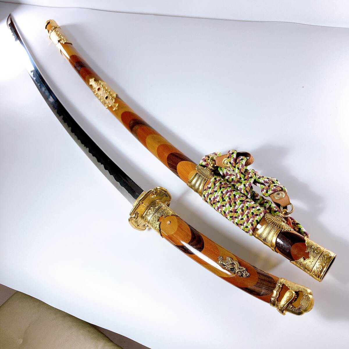 - |2125|総寄木細工 陣太刀 太刀拵え 約107cm 模造刀 刀剣 刀装具 骨董 日本刀 置物 オブジェ☆