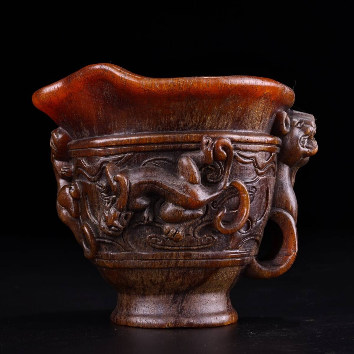 - ▽鴻▽ 角材細密彫 盤龍酒杯 置物 文房賞物 古賞物 古董品 時代物 稀少珍品 中国古玩 中国古美術