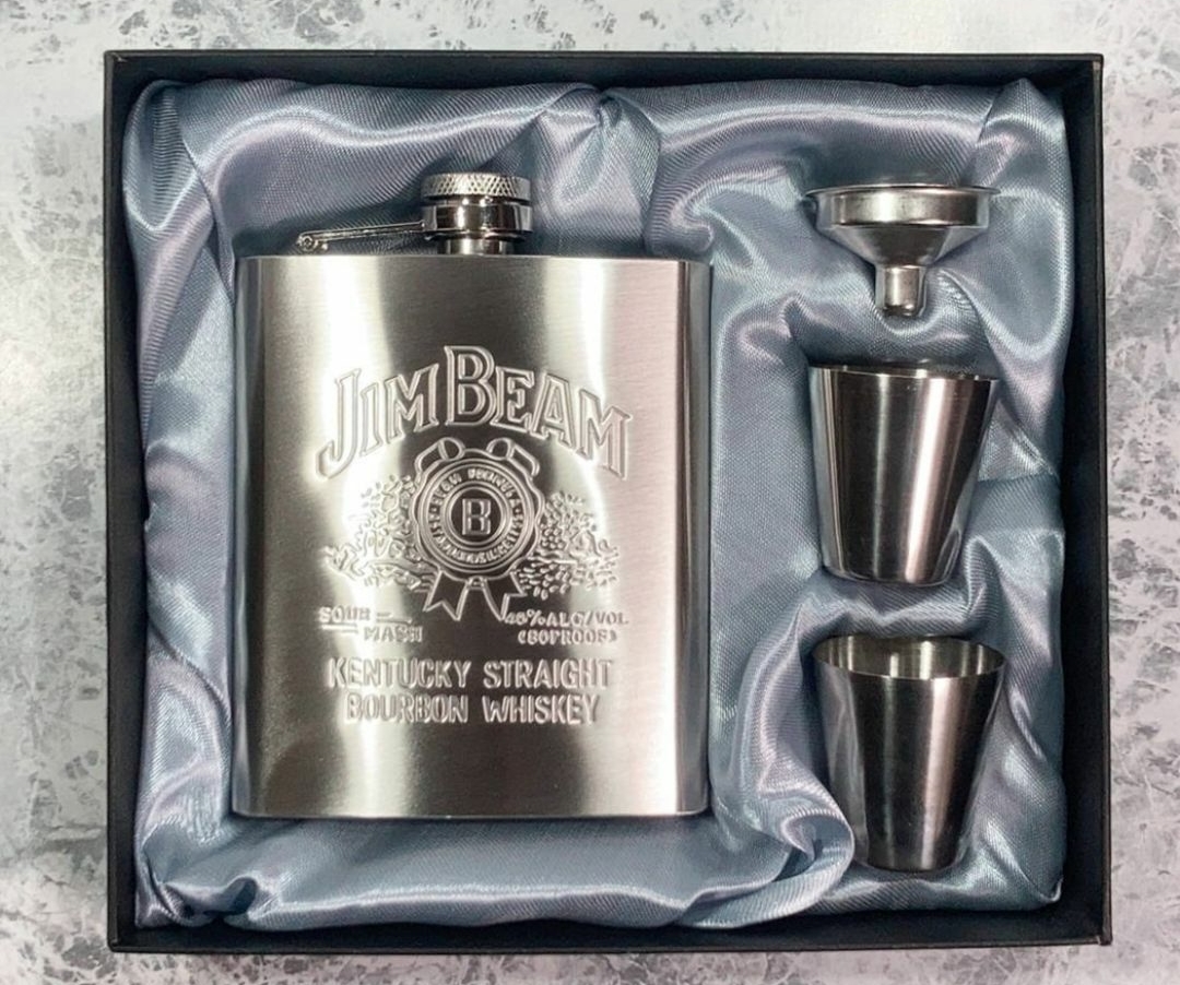 > ★送料無料★「ウィスキーフラスコ/スキットル ジムビーム 7オンス + ショットグラス + 漏斗 セット シルバー」tface-g 1