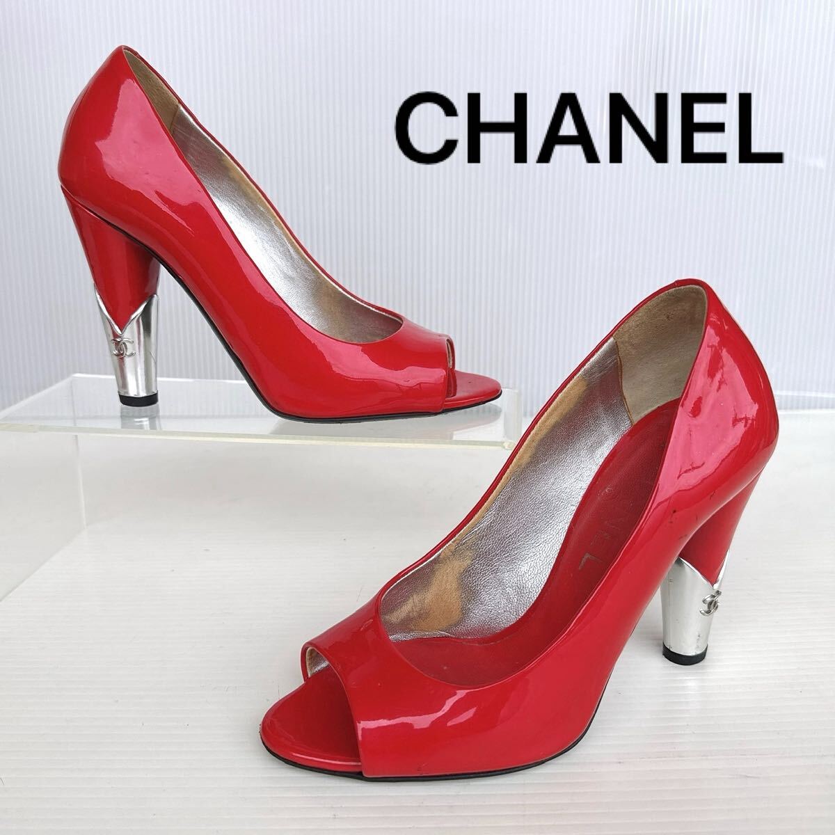 - CHANEL シャネル ココマーク オープントゥ ハイヒール パンプス サンダル パテントレザー 赤 靴 レーディス シューズ イタリア製 34