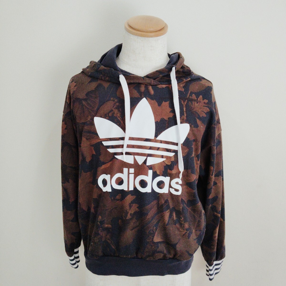 - 0815/L/adidas メンズ パーカー プルオーバー スウェット 総柄 プリント ブラウン 黒