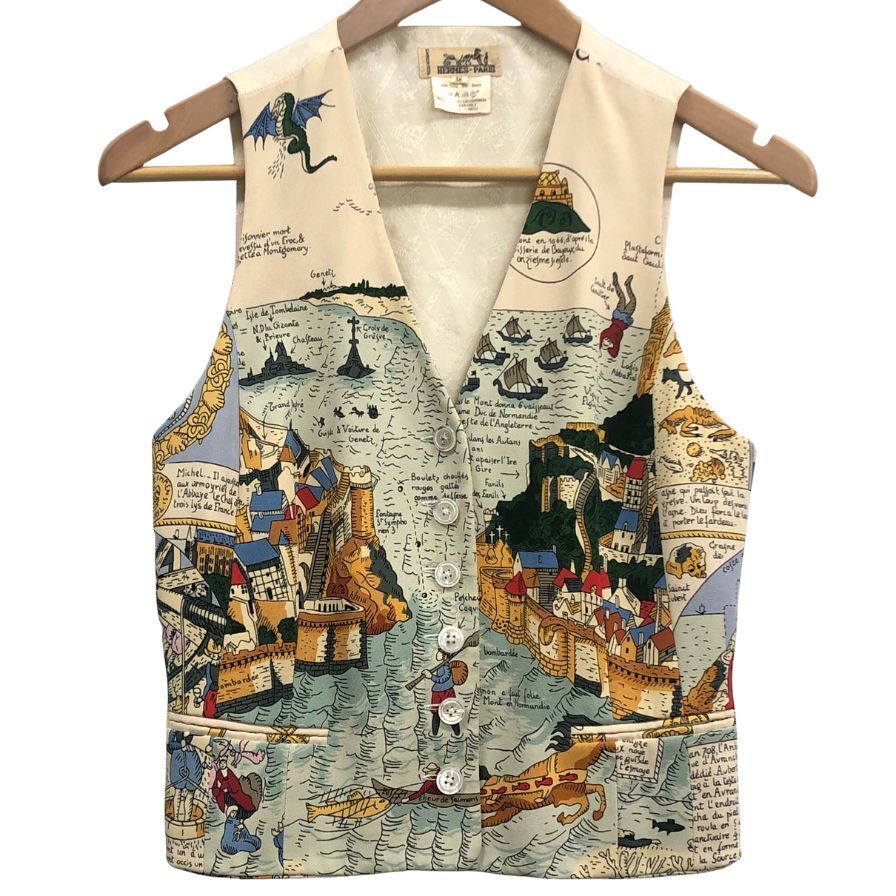 - 中古◆ベスト・ジレ エルメス ベスト マップイラスト風 シルク ボタン レディース 総柄 サイズ36 HERMES 【AFB11】