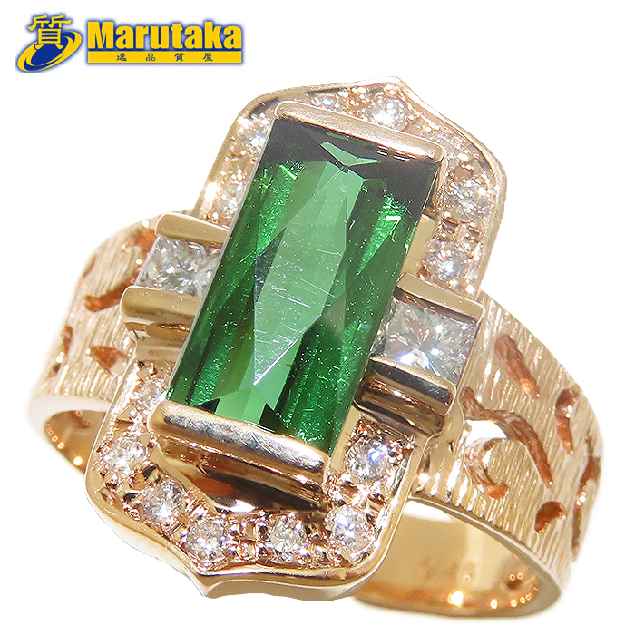 > グリーントルマリン ダイヤ リング 13号 K18PG 鑑別書 透かし柄 5.6g アンティーク Green Tourmaline Diamond 色石 みどり