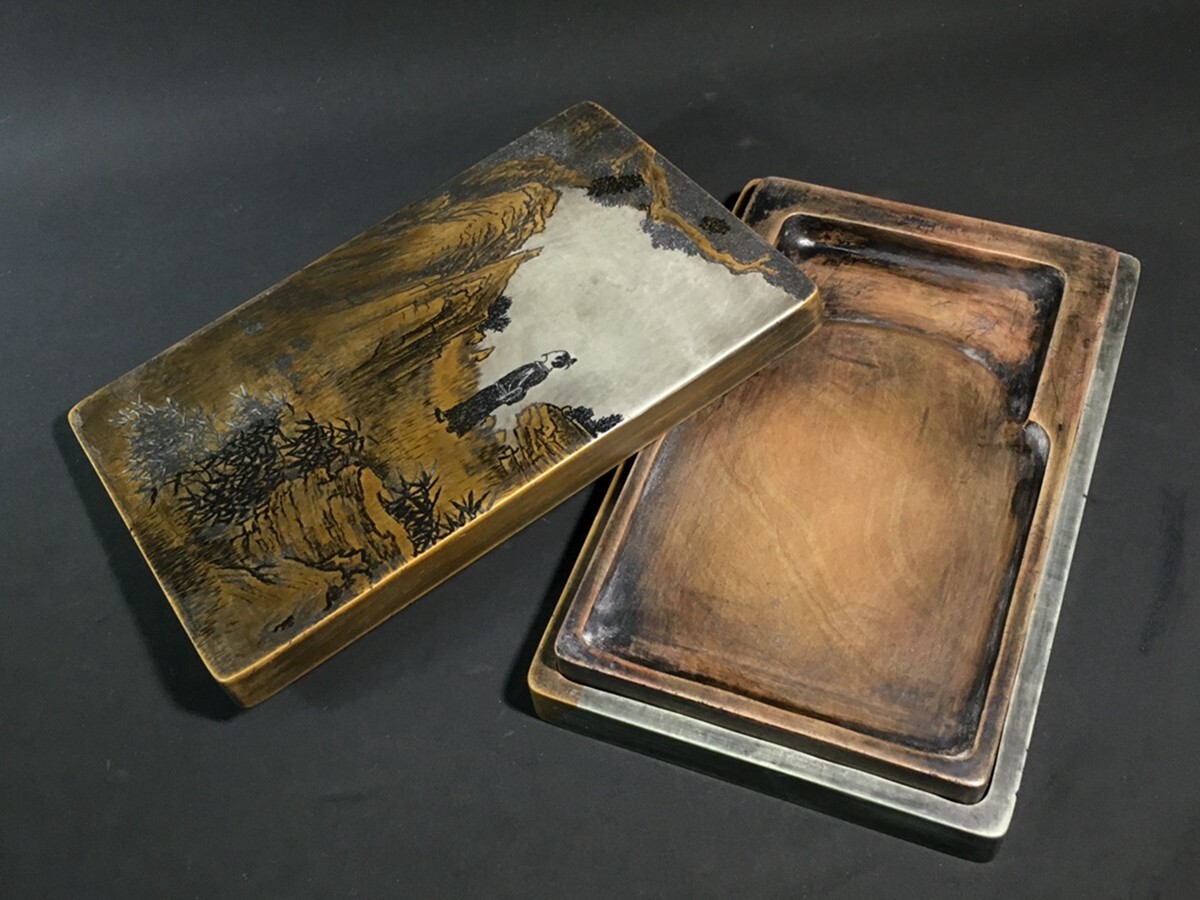 - 清代 松花石浮彫 尋山問道文房蓋硯 雍正年製銘【仁】手彫り 文房具 書道具 中国古硯 蔵出 骨董