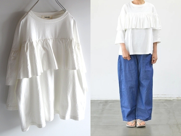 > tumugu ツムグ 2024SS リサイクルコットン天竺 ラッフルプルオーバー カットソー Tシャツ FREE 白 ホワイト ゆったり 日本製
