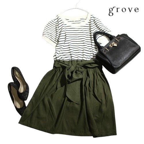 > 美品 グローブ grove 株) ワールド 夏 ボーダー柄 ドッキングワンピース M ホワイト 白 ネイビー 紺 カーキグリーン ワンピース 可愛い