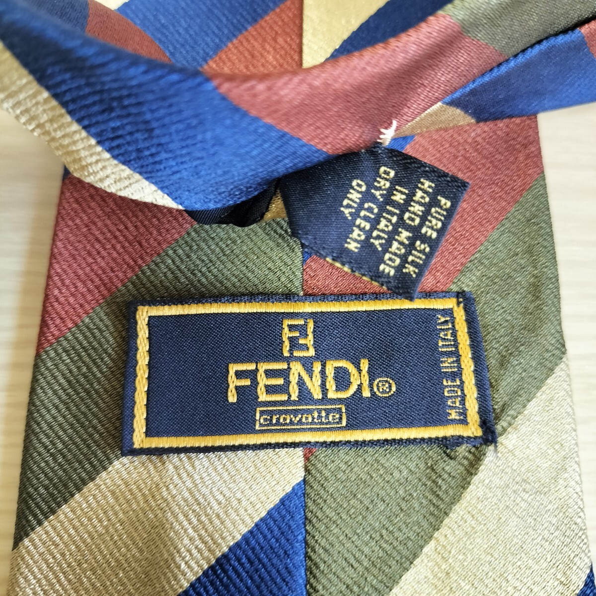 - FENDI(フェンディ)ゴールド緑茶青ストライプ模様のネクタイ