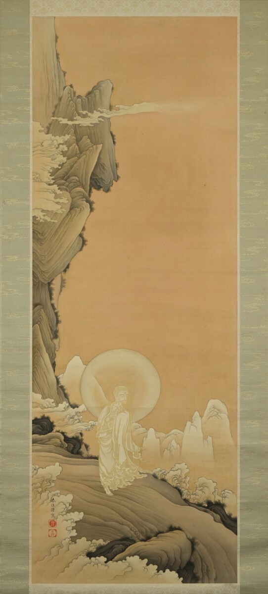 - 【真作 金裏箔】掛軸「奥村恭法 出山釈迦之図」大正2年48歳 共箱 日本画家 鬼頭道恭師事 仏画 絵画