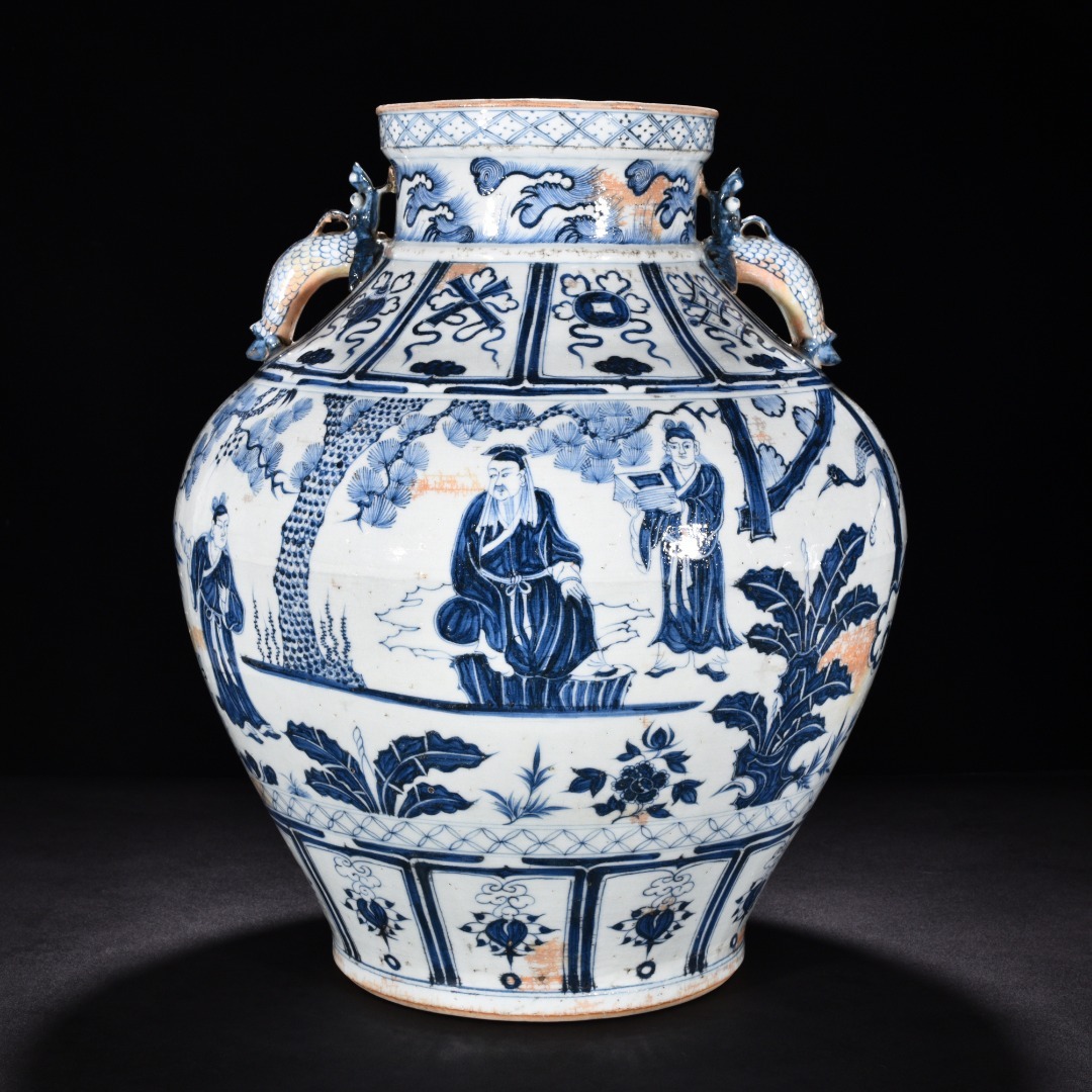 - 秘藏 元時代 青と白の 三顧の庵の 人物紋耳缶 時代物 汝窯 唐物 陶磁器 共箱付き 中国美術 高さ48 cm 幅35 cm 古物保証 818