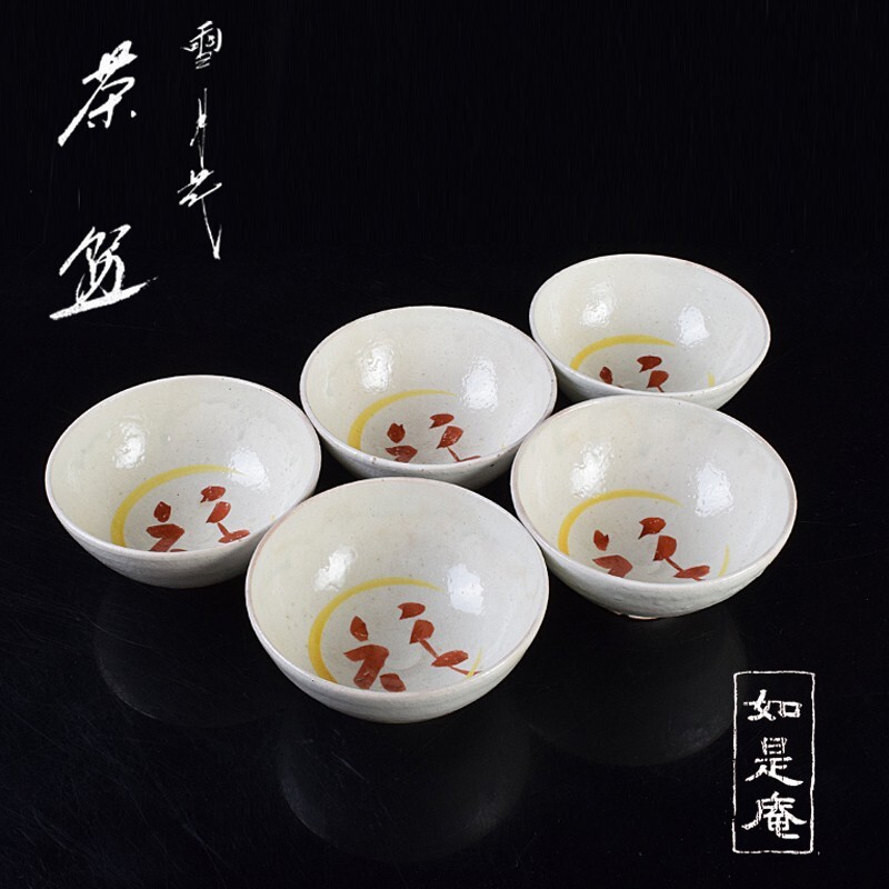 - 茶道具 京焼 岩倉窯 如是庵 雪月花 花高台 数茶碗 五客 共箱 VPTA