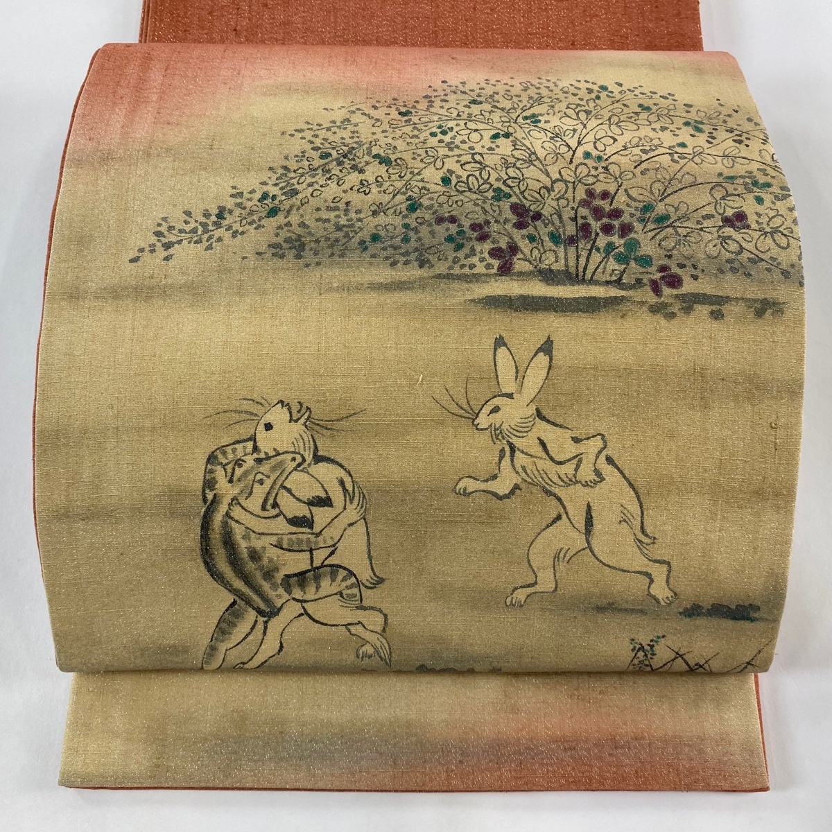 > 袋帯 美品 逸品 紬地 鳥獣戯画 萩 銀通し ベージュ お太鼓柄 正絹 【中古】