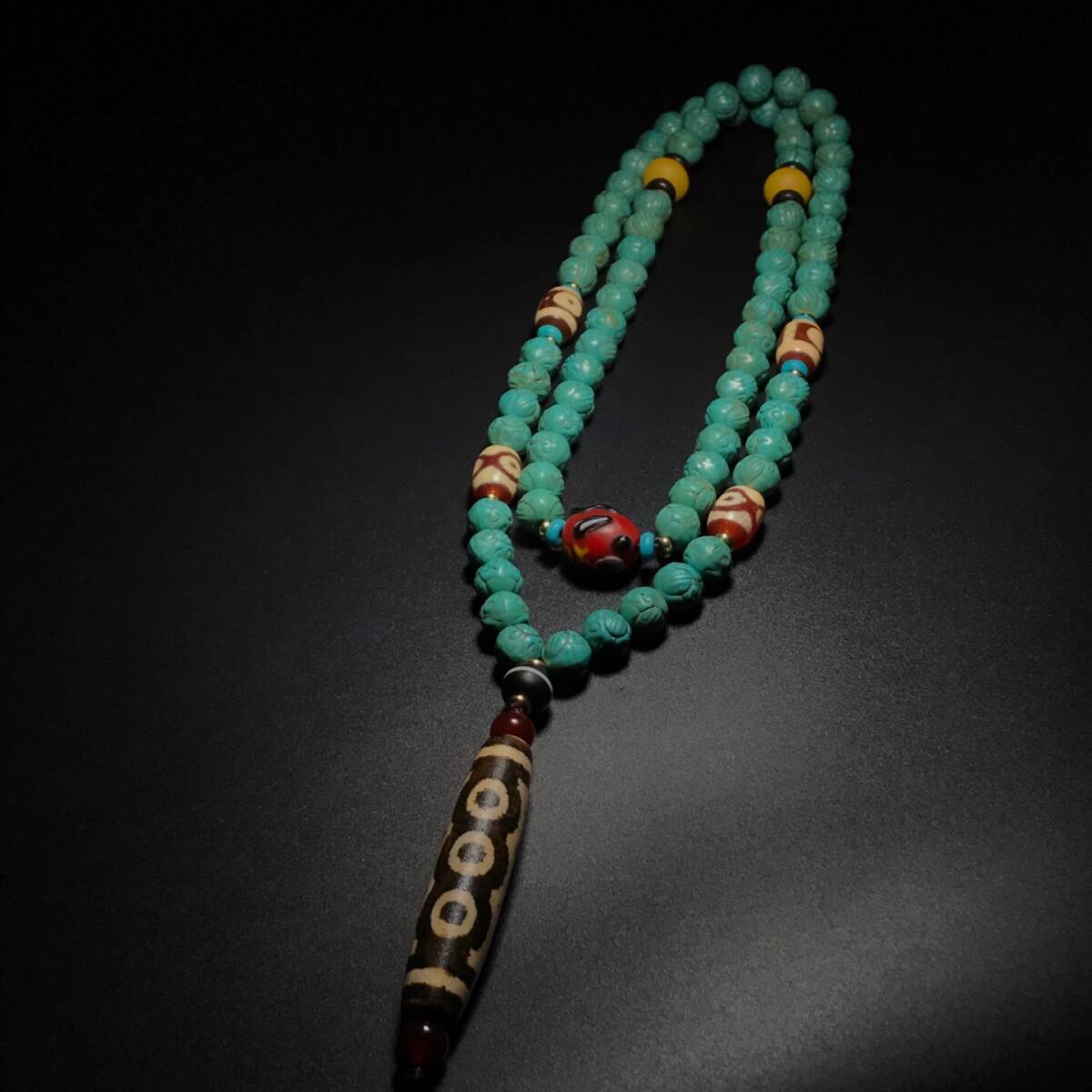 - 蔵友旧蔵出 瑪瑙製 細密彫 綠松石配五眼天珠ネックレス本 根付裝身具 希少珍品 貴重品 置物 古賞物 中国古玩 中国古美術品