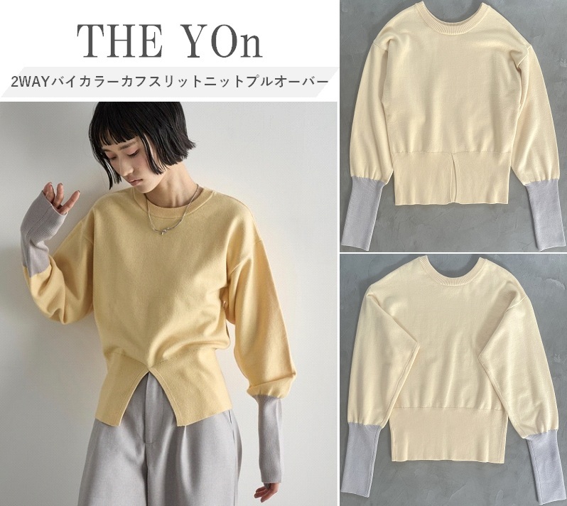 > THE YOn ザヨン 25SS 2WAYバイカラーカフスリットニットプルオーバー 華奢見えするサイジング バイカラーが映える◎ 前後着用可 YELLOW F