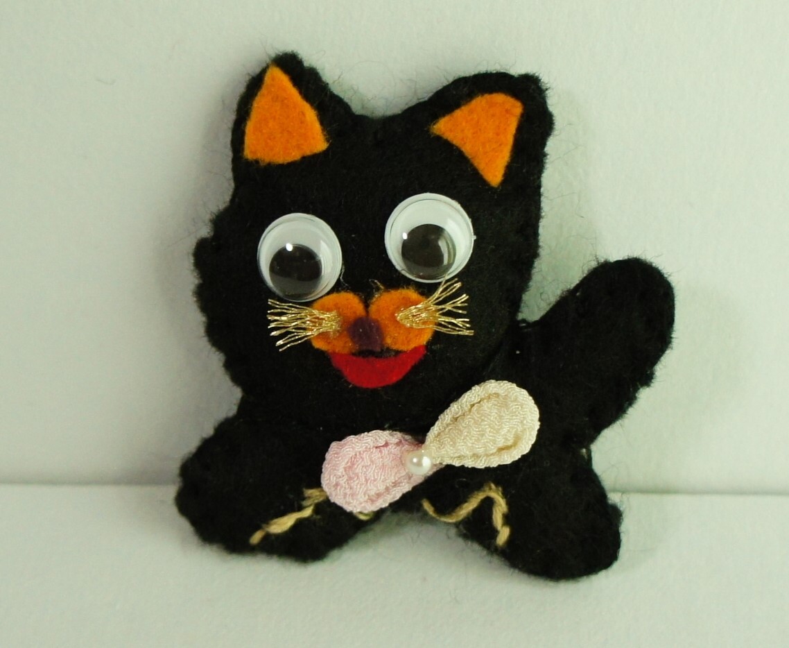 - ♪ ハンドメイド ブローチ ねこ 黒ネコ フェルト 動眼 綿入り ちりめん つまみ細工