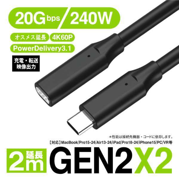 > USB-C延長ケーブル [USB-C オス→メス USB-C /映像 /充電 /転送 /2m /USB Power Delivery /240W /USB3.2 Gen2x2] ブラック GEN2X2-2X