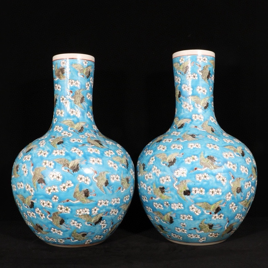 - 珍しい 唐物 中国 清時代 康熙年製 粉彩鶴紋 天球瓶 古染付 中国美術 骨董 古美術 820