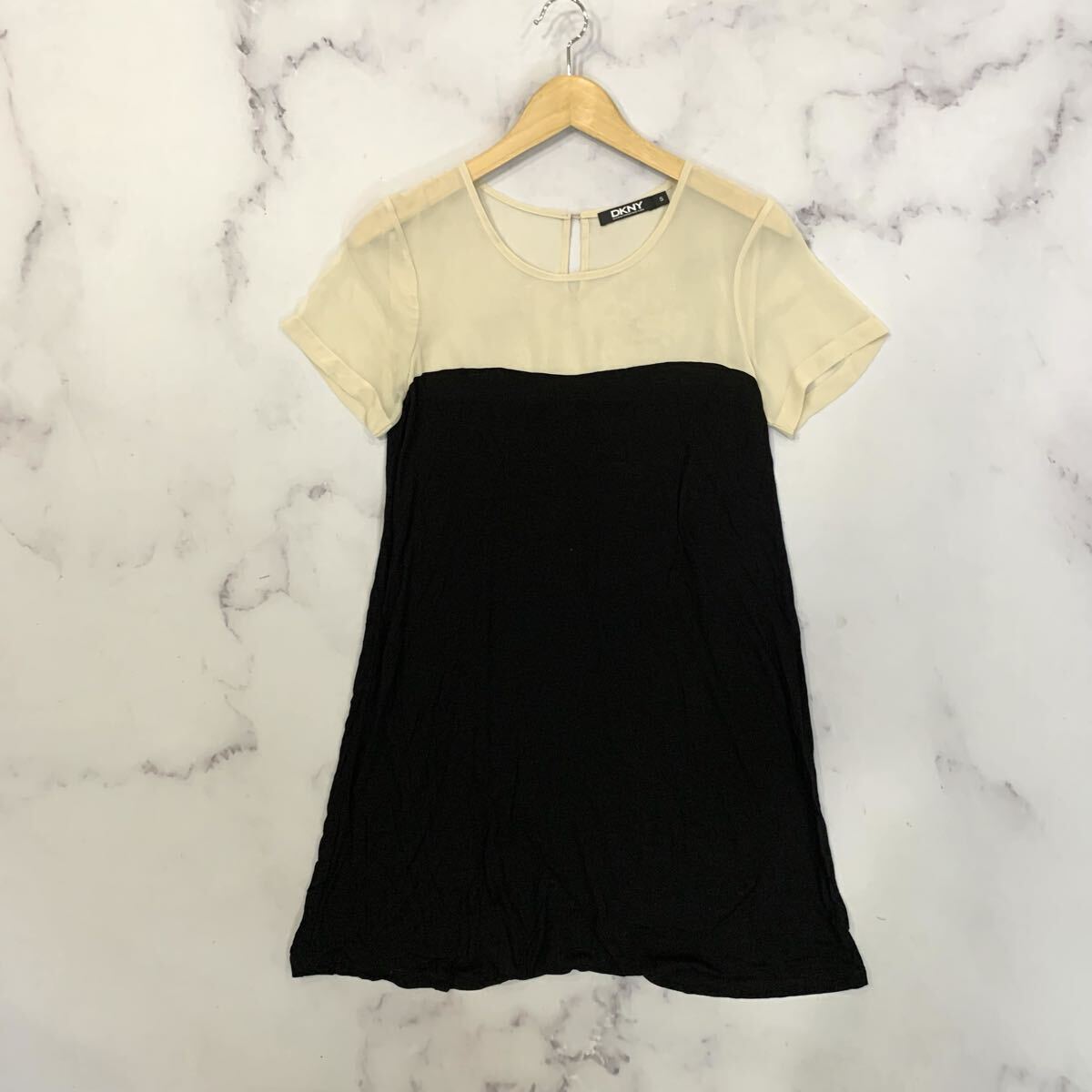 - V ▼ 洗練されたデザイン!! '異素材切り替え' DKNY ダナ キャラン 半袖 ストレッチ素材 レース チュニック ワンピース size:S トップス