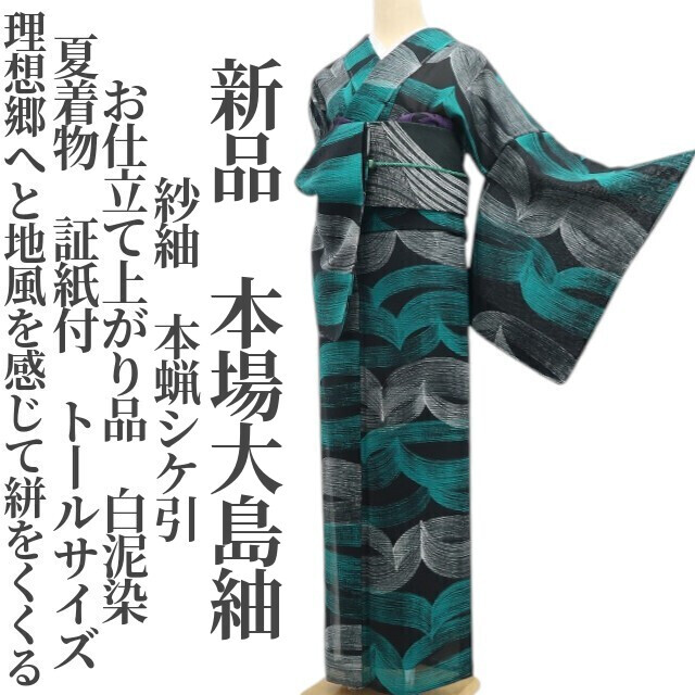 - tomihisa 新品 紗紬 本蝋シケ引 お仕立て上がり品 白泥染 夏着物“地風を感じて絣をくくる”証紙付 トールサイズ 本場大島紬 6602