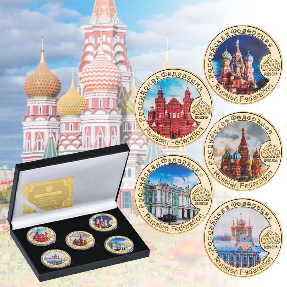 - ロシア 記念コイン 建築 5枚セット 赤の広場 クレムリン宮殿 聖ワシリイ大聖堂 エルミタージュ美術館 記念メダル 金コイン 高級ケース入り