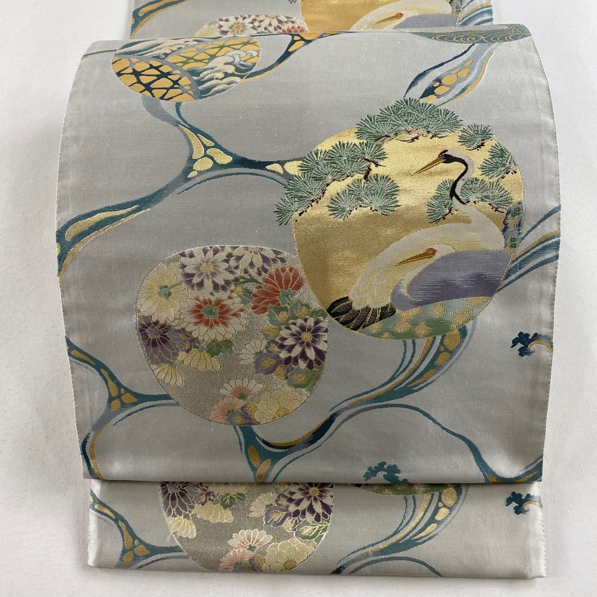 > 袋帯 美品 秀品 鶴 草花 箔 金銀糸 灰色 六通 正絹 【中古】