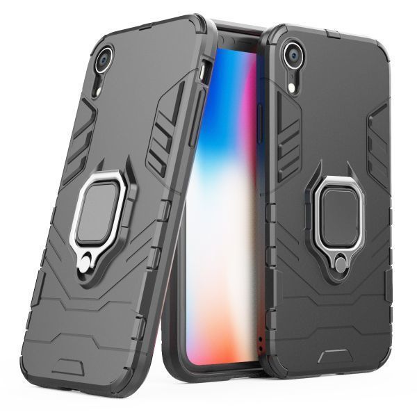 > T在庫処分 黒 iPhone XR 指リング付き ケース 衝撃吸収 カバー アイフォーン テン アール 本体保護 丈夫な耐衝撃 スタンド機能 アイホン