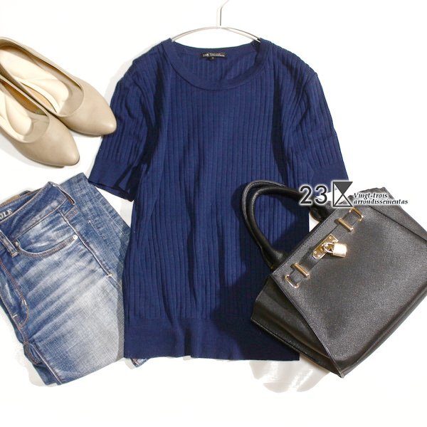> 美品 オンワード樫山 23区 綺麗め ワイドリブ コットン ニット プルオーバー 38号 M 春 夏 25B05
