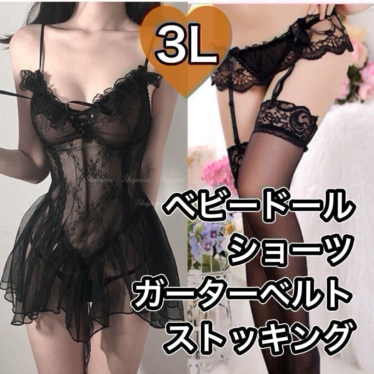 - ベビードール Tバックショーツ ガーターベルト ストッキング タイツ ブラック フリーサイズ 3Lサイズ セクシー ランジェリー レース XXL