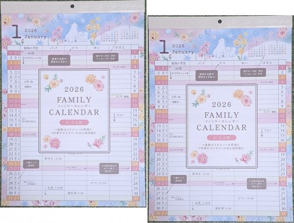 > 【送料無料:2冊:ファミリー:カレンダー:A3:42x30cm】★「家族の予定が一目でわかる」:4~5人:家族用★2026年:令和8年:壁掛け:暦:No1D