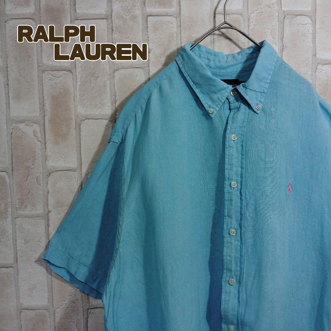 - ラルフローレン シャツ 半袖 水色 リネン 刺繍 ロゴ XL