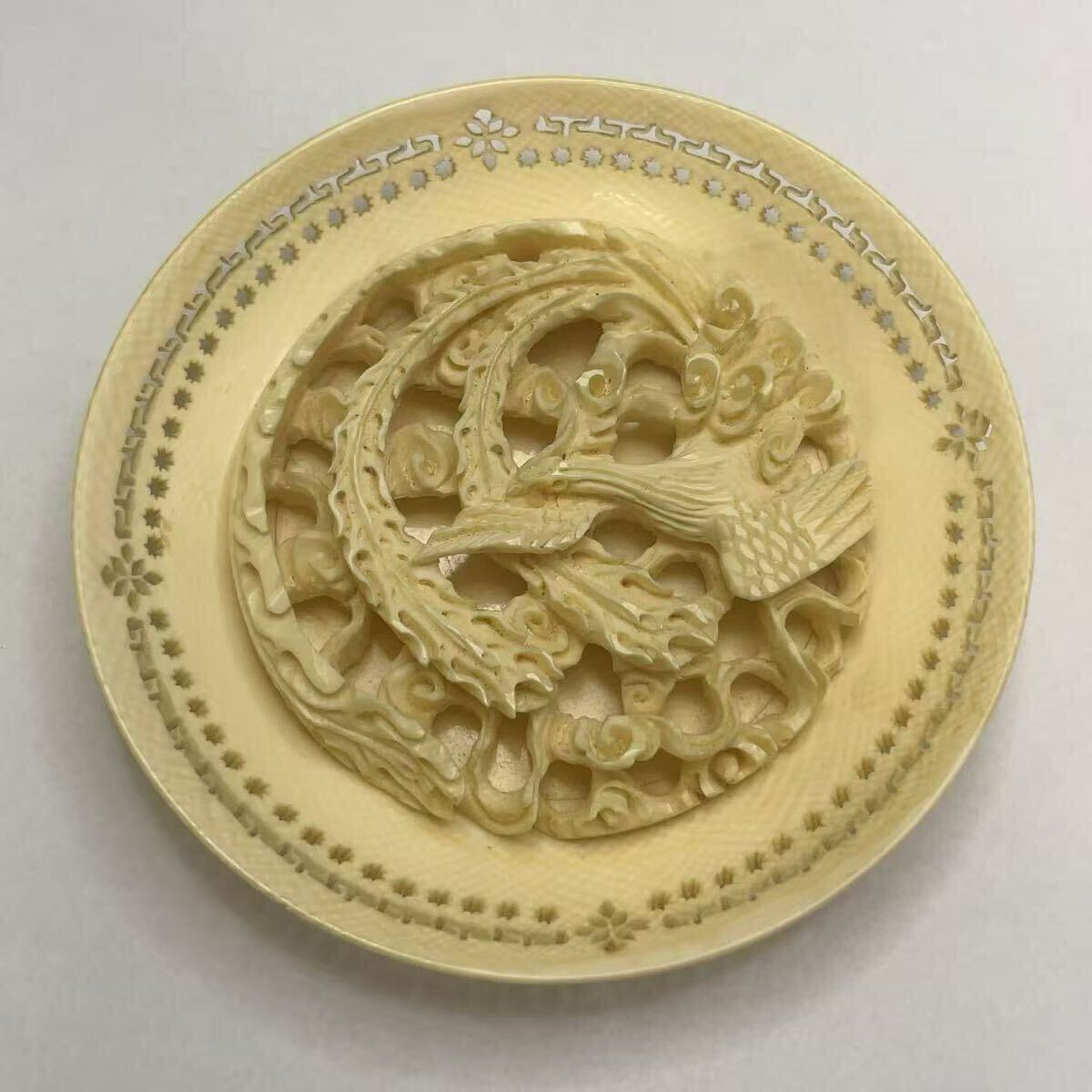 - 天然材 鳳凰 彫刻 円形 細密透かし 材質保証 高級美術品 古美術 径約10cm 厚み1.6cm