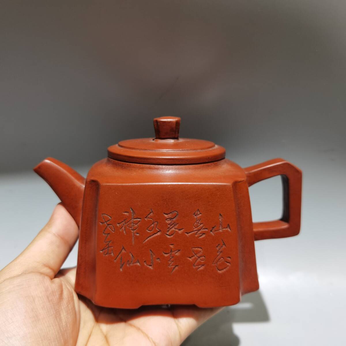- 【超珍館蔵】紫砂壺 刻字四方壺 顧景舟款 紅泥 茶具 茶道品 置物 賞物 古賞物 古董品 古美術品 時代物 旧家蔵出 稀少珍蔵品