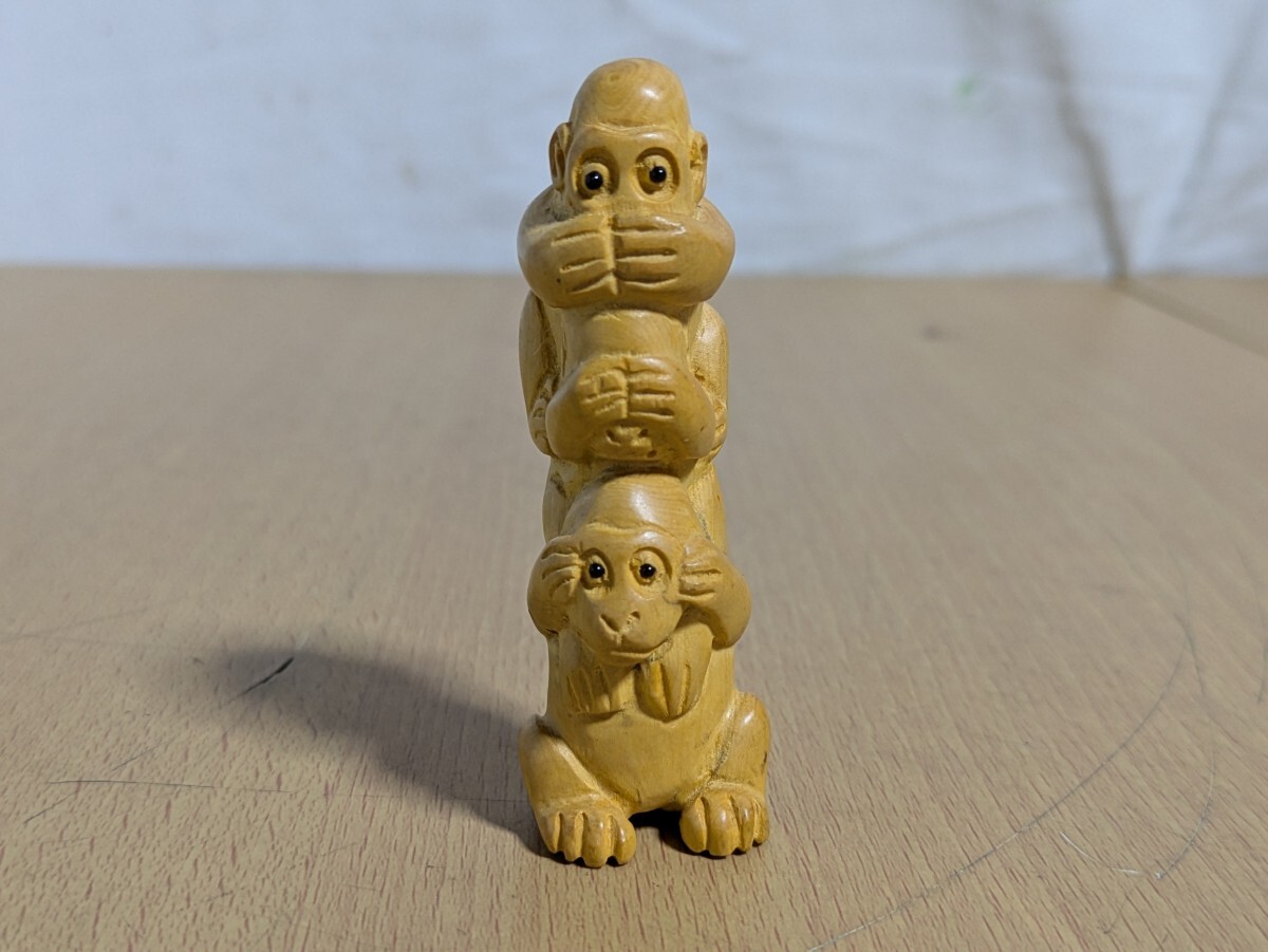 - 木彫 根付 見ざる言わざる聞かざる ガラス目 彫刻 サル 三猿
