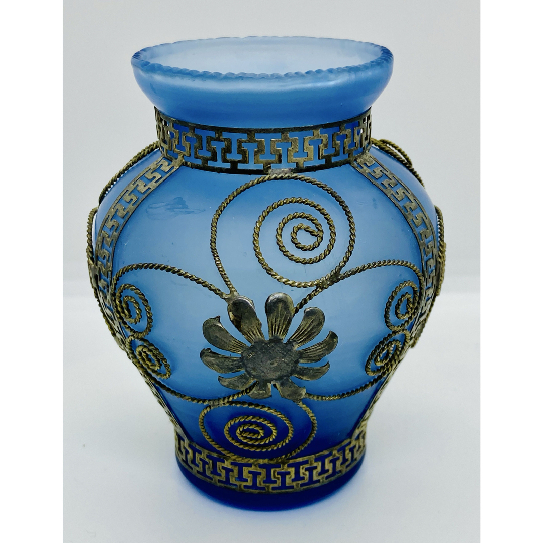 - ギリシャ製 ブルーサテンガラス花瓶 シルバーフィリグリーワイヤーオーバーレイ