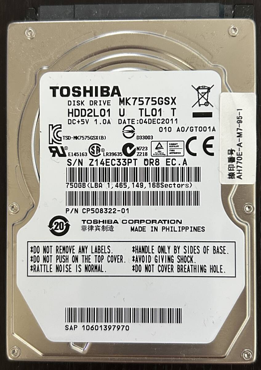 - 即決 中古 TOSHIBA 750GB 使用時間3061時間 2.5インチ 内蔵ハードディスク CrystalDiskInfoにて確認済み 正常 【MK7575GSX】A26