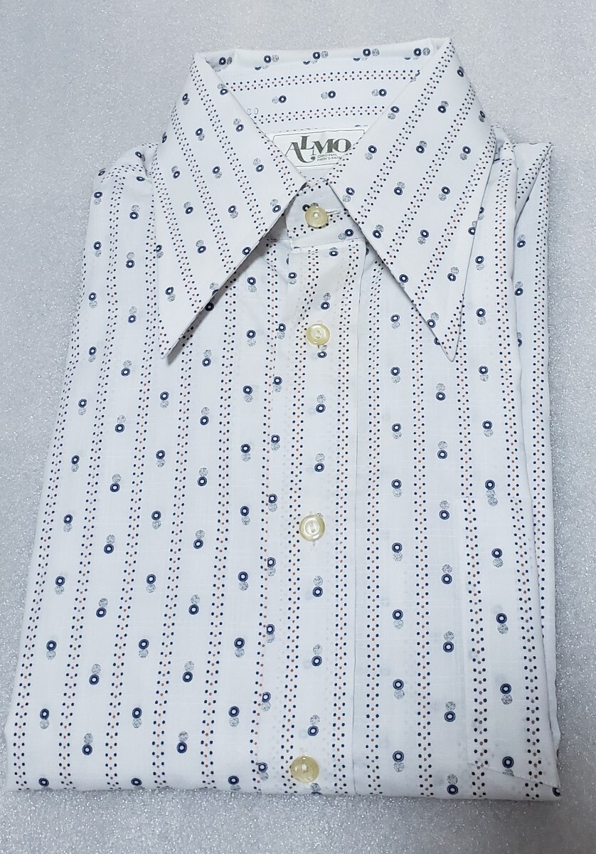 > L 1970年代 未使用(糊付き保管の為薄い変色有り)メンズシャツカラー 昭和レトロ ホワイト 幾何学模様風 総柄 胸ポケット有 ヴィンテージ