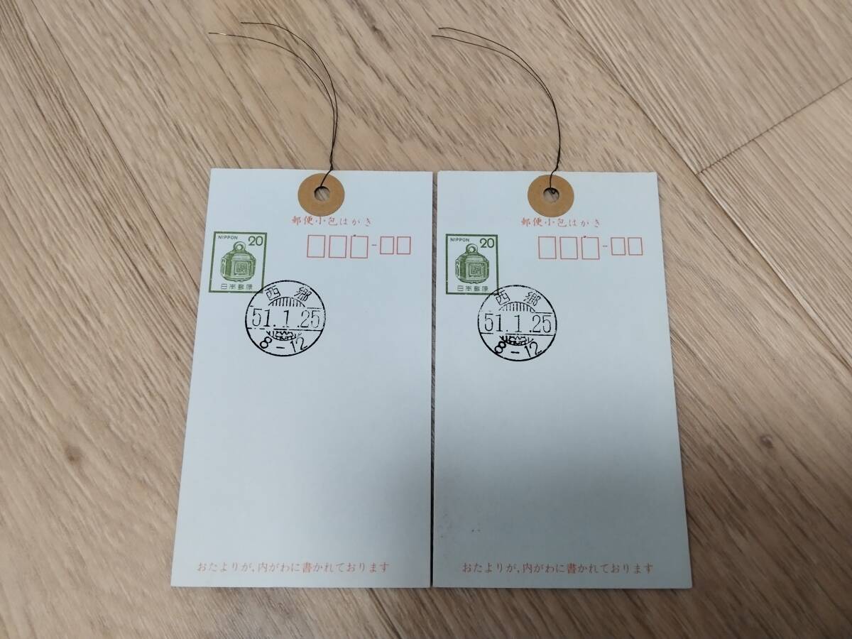 - 郵便小包はがき 20円駅鈴 西郷 初日印 ハリガネ付き 2枚