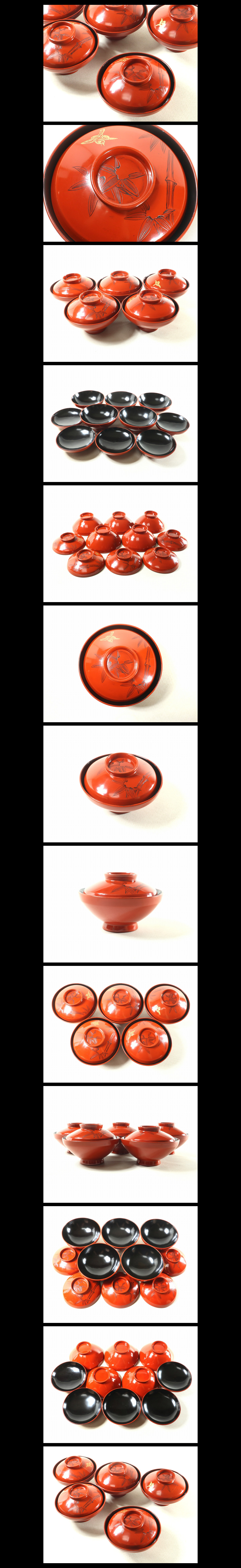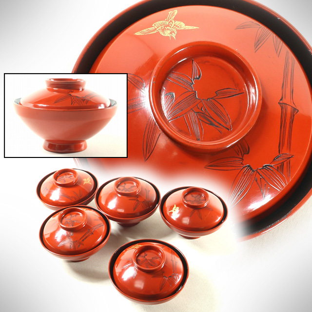 ●c2046●【輪島塗沈金沈黒吸物椀5客 雀竹 塗分朱内蝋色黒地 布着堅地】検お茶会煎茶道具茶懐石蓋付椀蒔絵●西瓜●