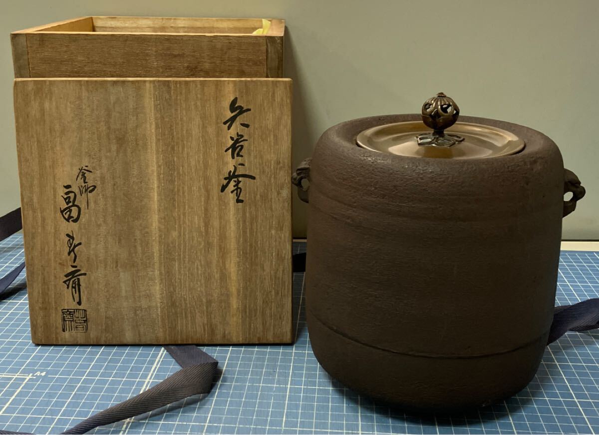 - 【釜師 初代畠春斎 矢筈窯 鉄釜 茶道具】筒釜 金属工芸 釜師 木箱付き 鉄製品 金属工芸【B1】0827