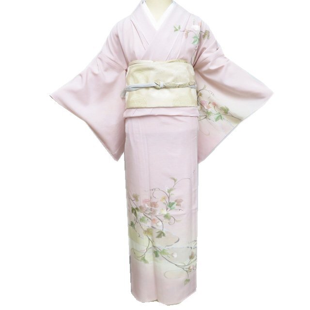 > 特選 夏物 夏着物 訪問着 着物 中古 正絹 絽 汕頭刺繍 紋付き 花の図 金糸 乙女色 多色 身丈166cm 裄65cm L トール きもの北條 A1263-2
